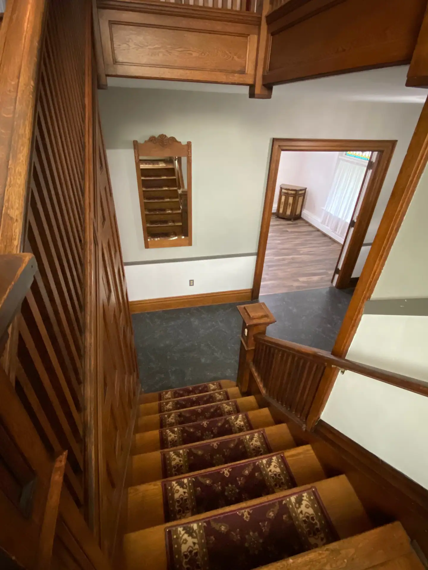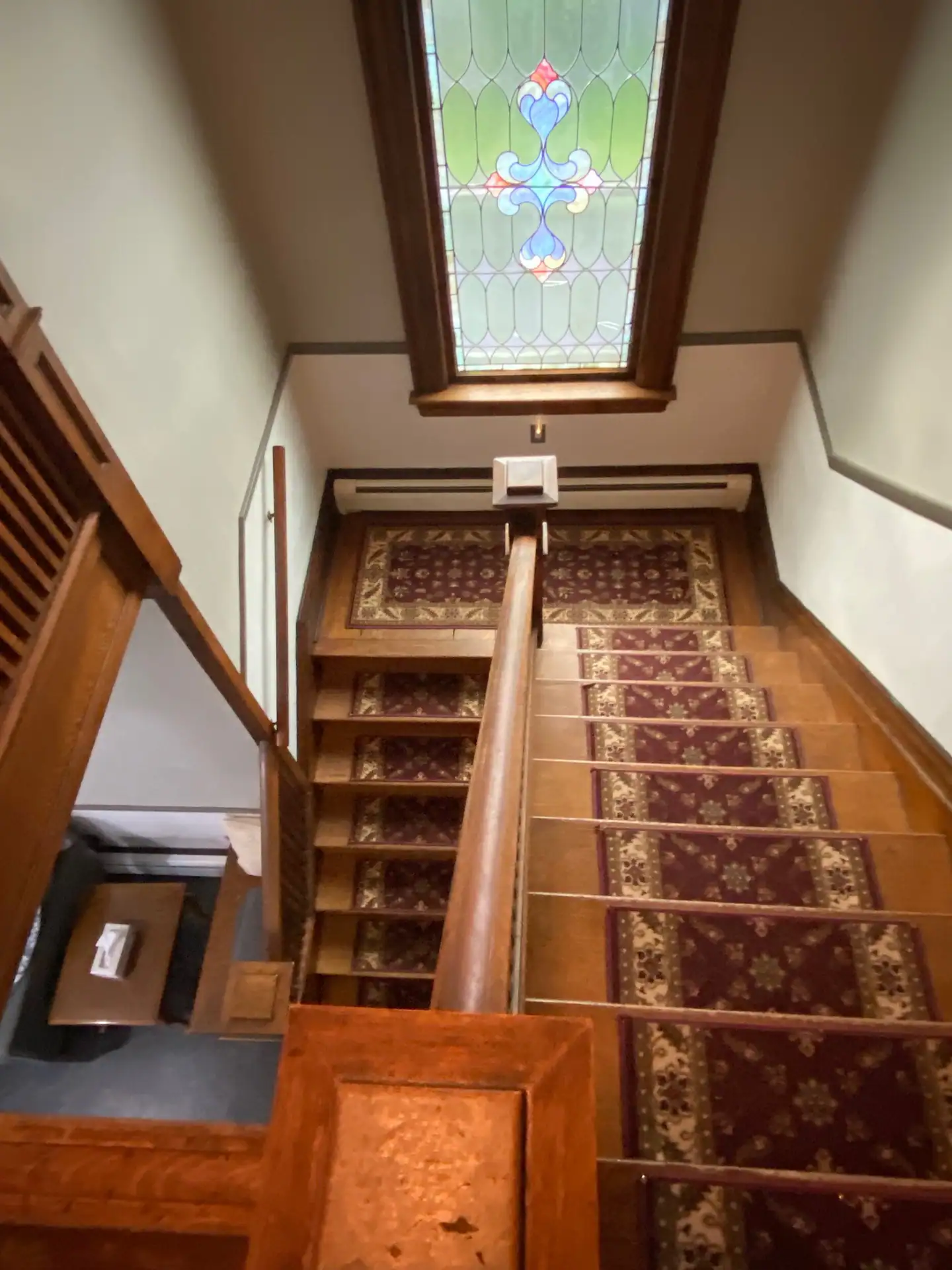“Stairways from first floor to the second floor with one platform halfway up.”